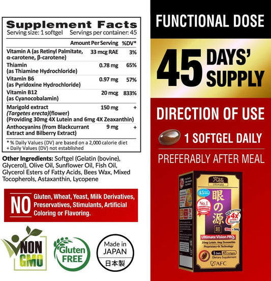 AFC Japan Ultimate Vision PRO – Improved, Up-Sized Formula - Support Vitamins for Eye Health with Lutein, Zeaxanthin 4X, Bilberry, Nutrients for Blurry Dry Eyes, Macular Health & Focus, 45 Softgels