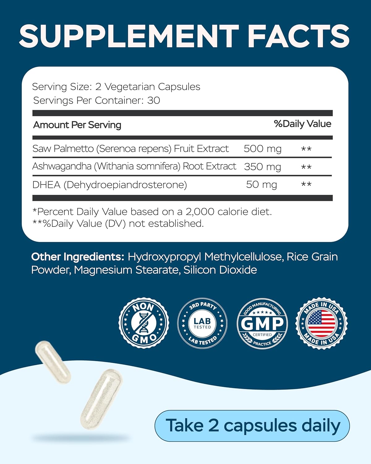 Powerful Ingredients - Saw palmetto herbal supplements paired with DHEA supplements for men provides essential hormonal balance and prostate support, while Ashwagandha supplements helps combat stress and boosts energy. This carefully crafted blend is designed to optimize men’s vitality, enhance well-being, and promote healthy hair.